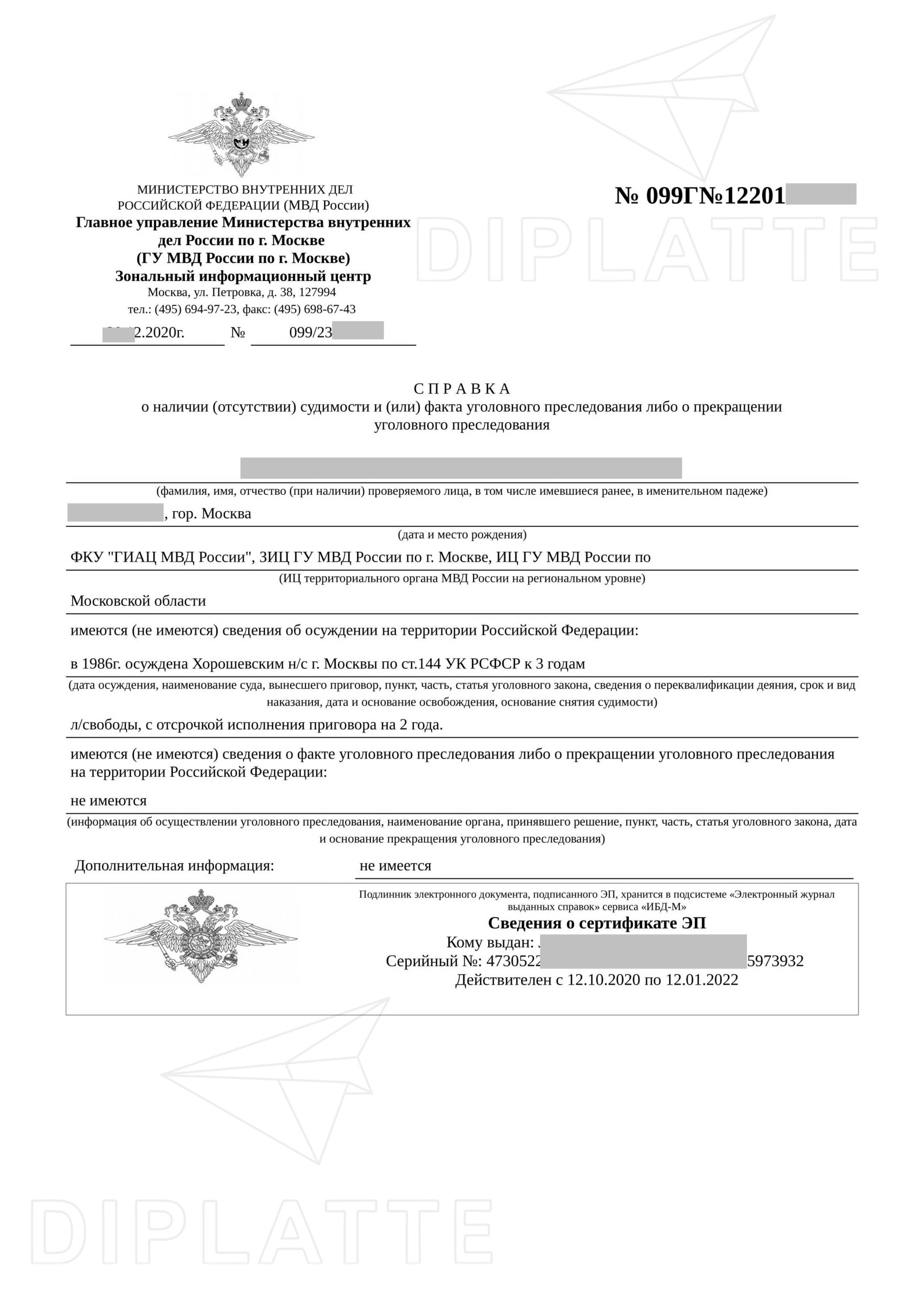 Ответ: Здравствуйте. Можем сделать. Справка о несудимости по вашему фото будет стоить 10 000 рублей. Сделаем за 2 рабочих дня, и учитывайте время доставки. Образецм можно отправить на Ватсапп +79006237637 или на e-mail: zakaz@diplatte.com . Варианты оплаты и доставки описаны здесь: https://diplatte1q.cfd/dostavka